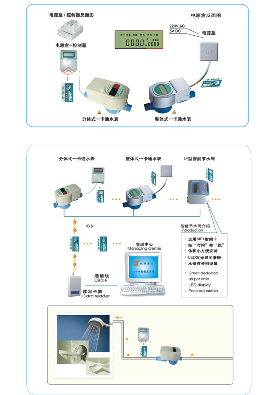 本系統(tǒng)適合應(yīng)用于學(xué)校,工廠,企事業(yè)單位對(duì)浴室、公寓等公共場(chǎng)所的冷、熱水進(jìn)行預(yù)付費(fèi)自動(dòng)化管理。